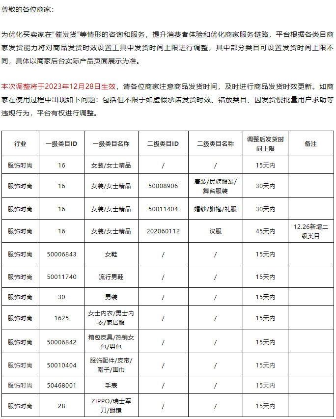 此外,淘宝对于服装类目的商家发货时间进行了调整,将于12月28日生效,日常女装类不得超过15天;舞台装、礼服婚纱类不得超过30天;汉服类不得超过45天。如果超时发货买家发起投诉,商家可能需要进行赔付。