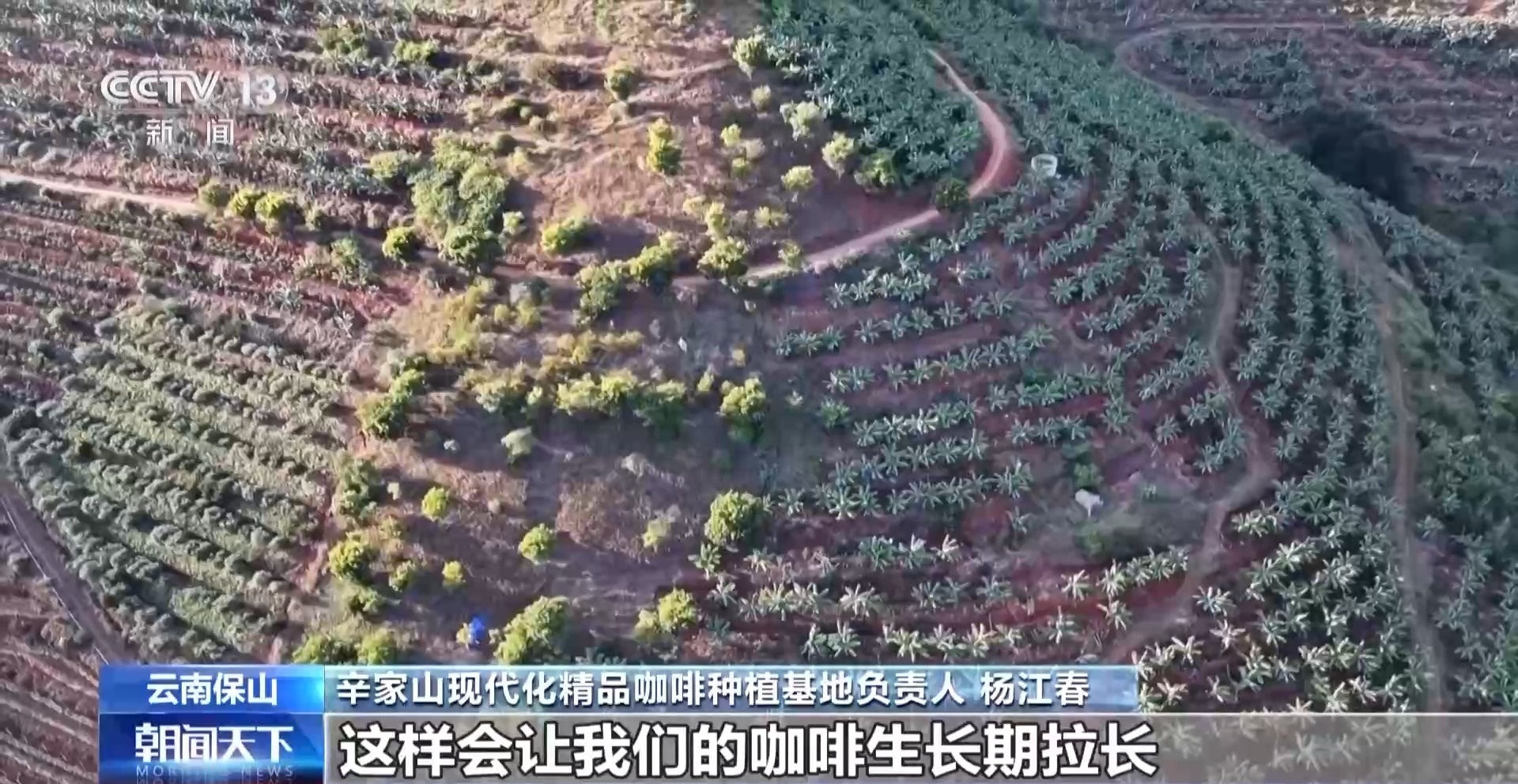 云南保山辛家山现代化精品咖啡种植基地负责人 杨江春:主要是为了给咖啡遮阴,这样会让咖啡生长期拉长,从而品质会更好。地上也不是一般的杂草,是我们的绿肥,叫紫花苜蓿,它可以给土壤固氮,同时给咖啡树做了保湿的作用。它枯了之后,这些都是很好的有机肥。