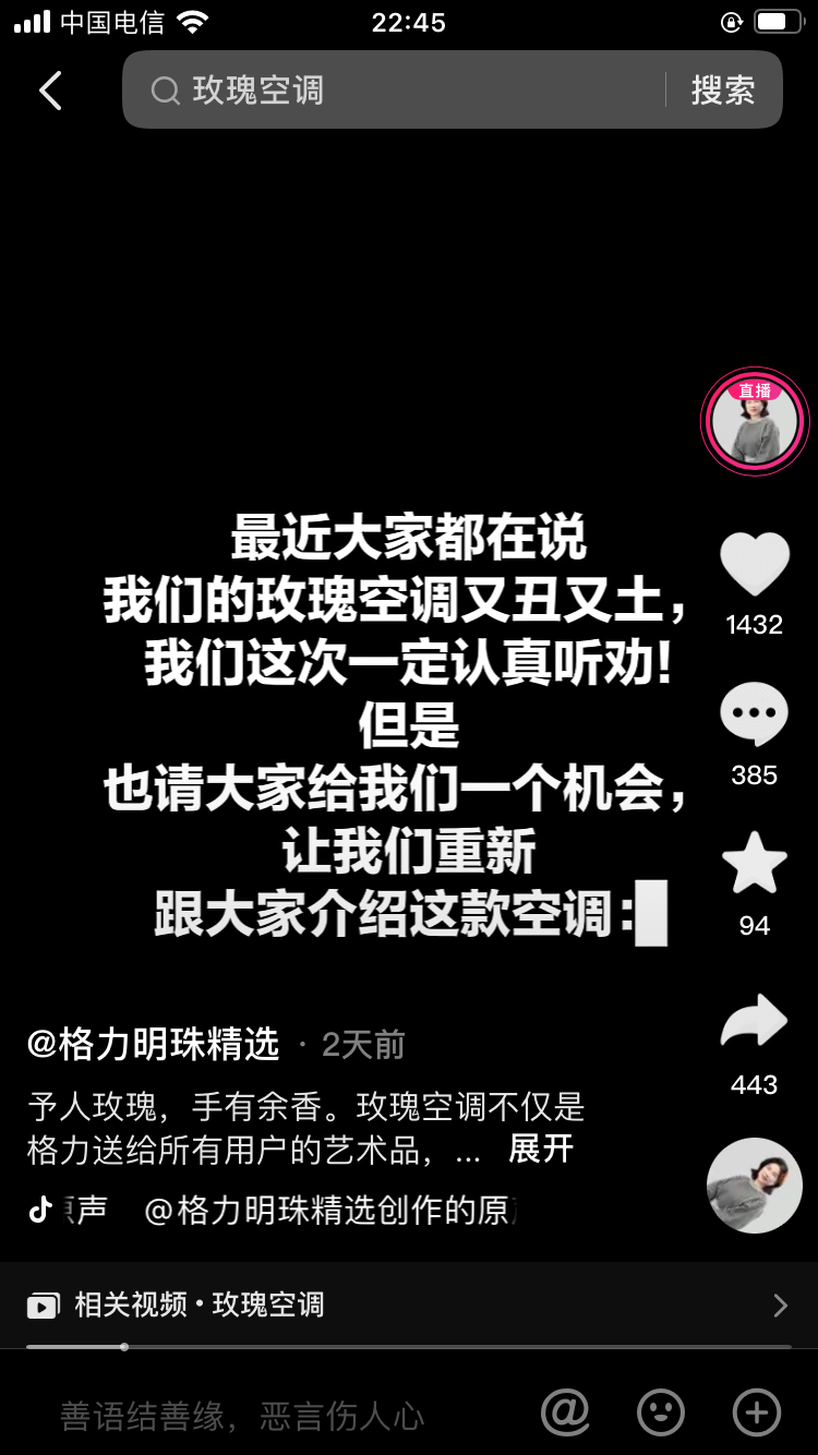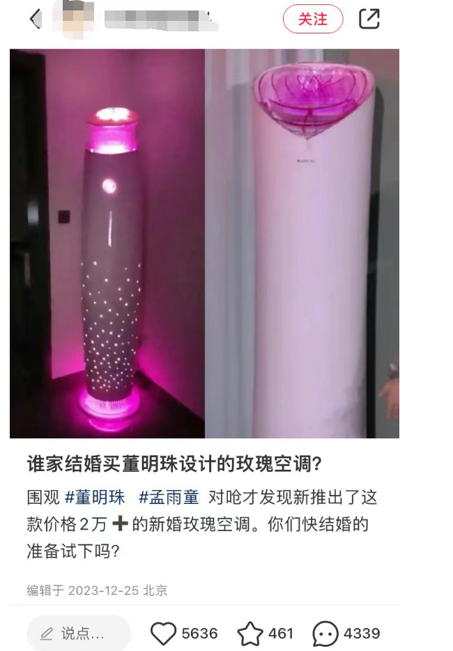 对此,格力电子商务有限公司@“格力明珠精选”发布视频表示,收到了大家的吐槽,“董总说要用玫瑰向用户表达爱意,让这台空调成为值得收藏的艺术品,为了这个追求,我们不断努力”。视频介绍,这款玫瑰空调历经三次换代、四次升级,精心设计的外观,才让它不断接近玫瑰的生动造型。