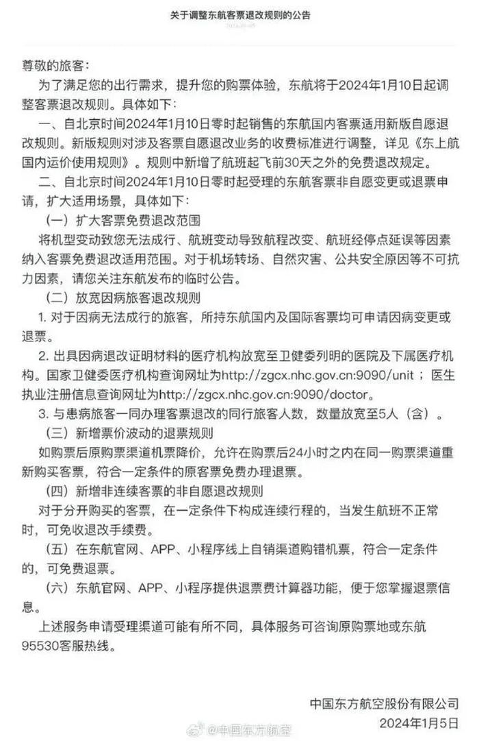 1月5日,中国东方航空发布公告,将于2024年1月10日起调整客票退改规则。规则新增了航班免费退改规定,扩大了东方航空客票非自愿变更或退票申请的适用场景。东方航空是继南方航空后第二家宣布调整客票退改规则的航司。