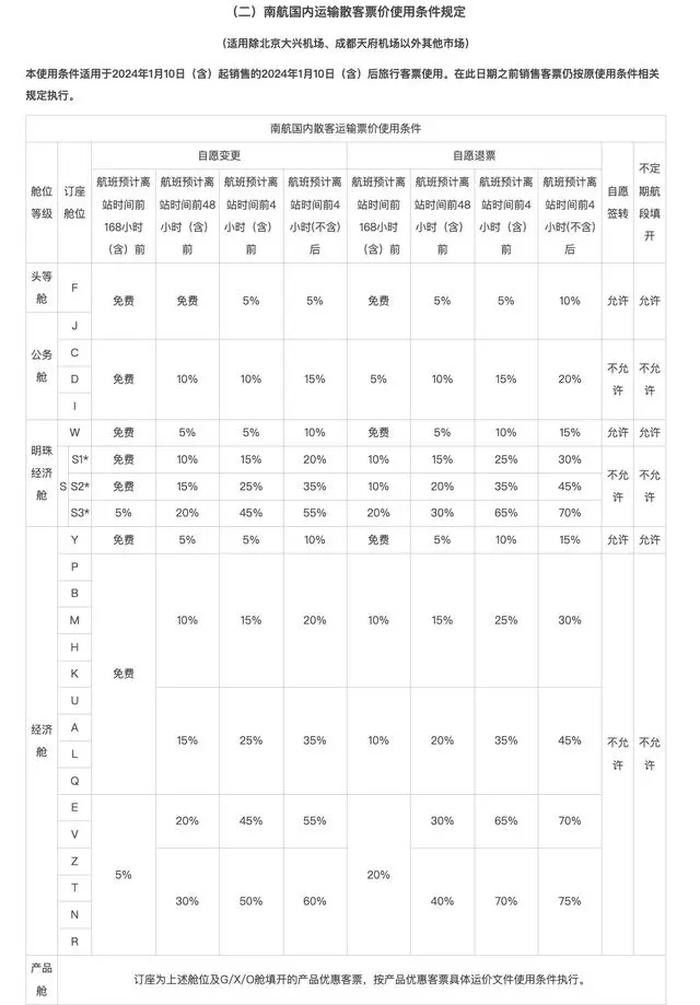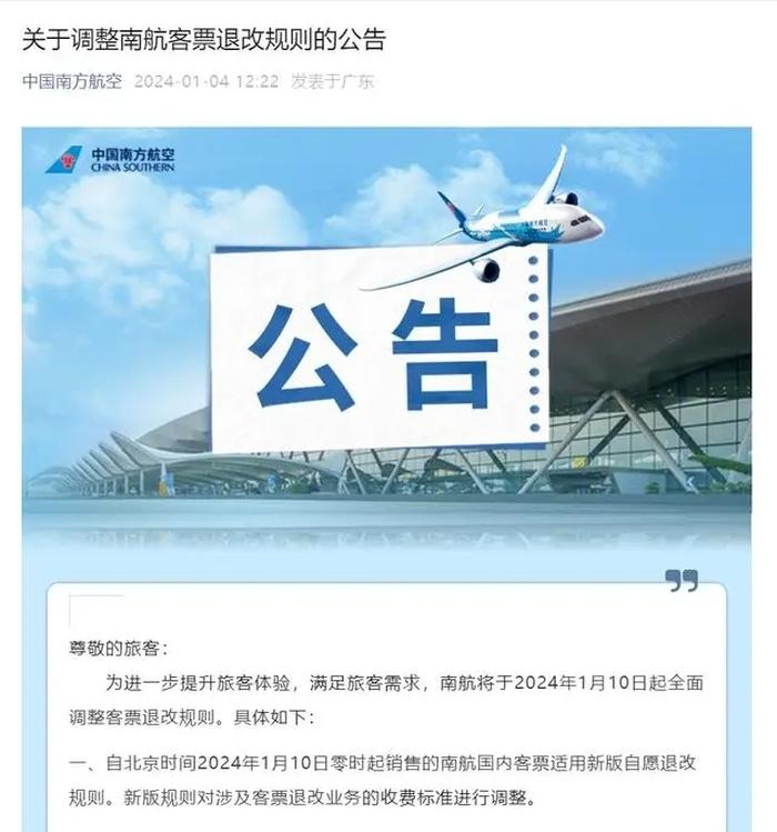 值得一提的是,1月4日,南方航空就发布了关于调整南航客票退改规则的公告。公告称,南航将于2024年1月10日起全面调整客票退改规则。