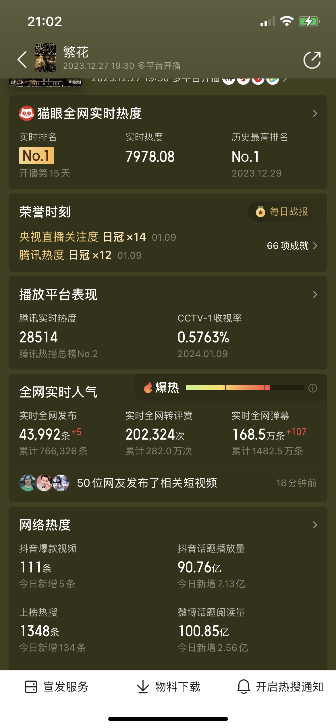 意想不到的是,《繁花》播出后,火速出圈,豆瓣评分8.3分。猫眼数据显示,《繁花》在映前两周,微博上相关的营销话题开始增多,话题合计超60个,在上映当周营销话题有128个,映后第二周营销话题达245个。网络热度方面,截至1月10日21时,抖音话题播放量90.76亿,微博话题阅读量超百亿。
