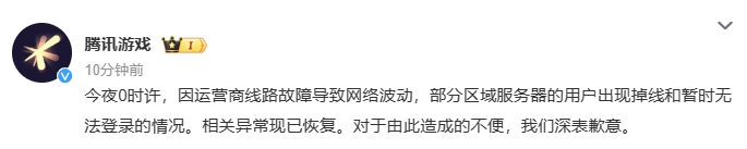 1月12日,@腾讯游戏对网友称“游戏掉线和无法登录”的情况作出回应:今夜0时许,因运营商线路故障导致网络波动,部分区域服务器的用户出现掉线和暂时无法登录的情况。相关异常现已恢复。对于由此造成的不便,我们深表歉意。