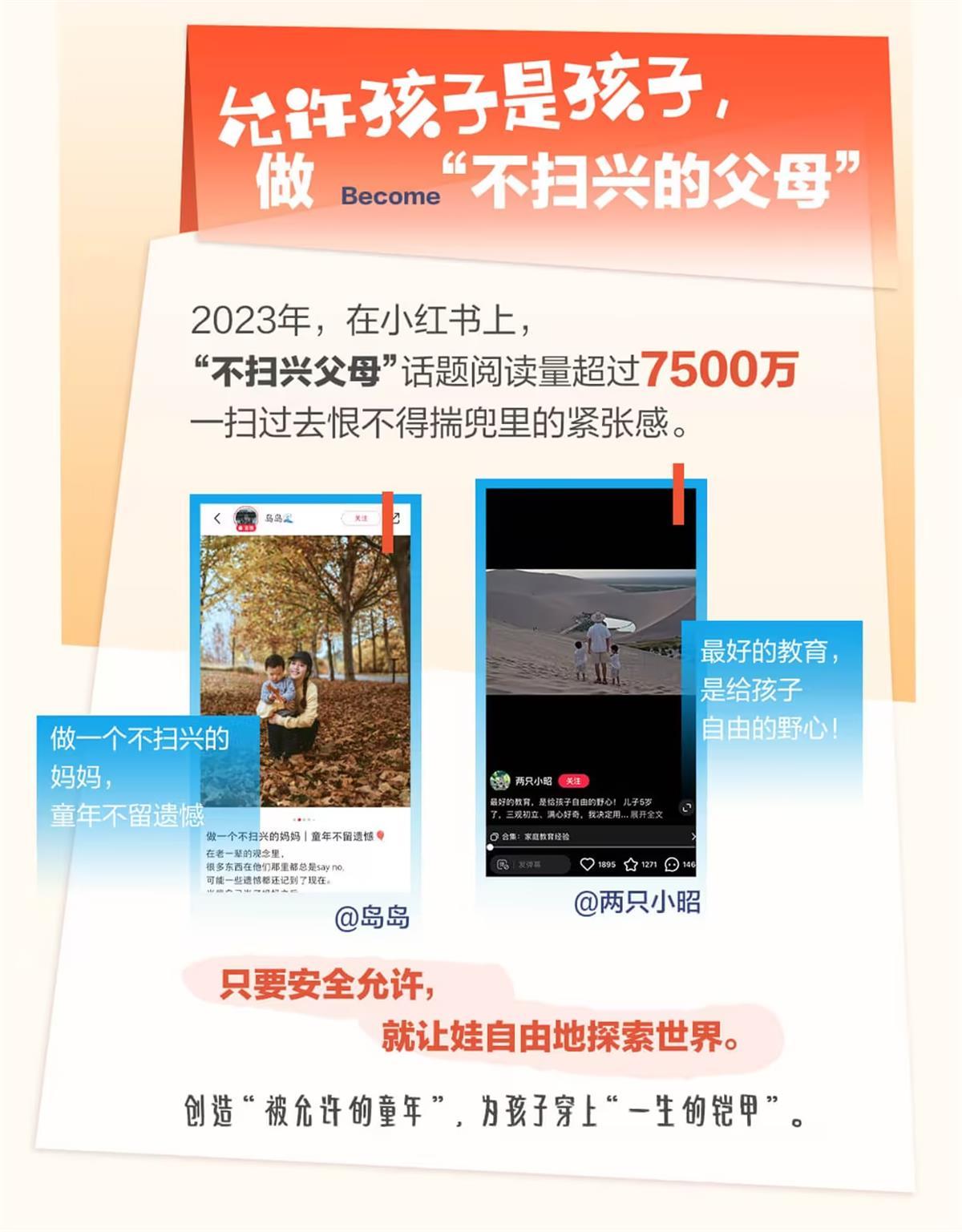 同时,他们也争做“不扫兴父母”,允许孩子只是孩子,放手让TA自由探索世界,拥有一个被允许的童年。踩水坑、爬草坪、做家务……不用成人经验浇灭童心,让珍贵的好奇种子再“长一点”。2023年,小红书上不扫兴父母相关话题阅读量达到7500万。参与“不扫兴父母养成计划”的新手爸妈,在千万网友陪伴下,做持续成长型的进阶爸妈。