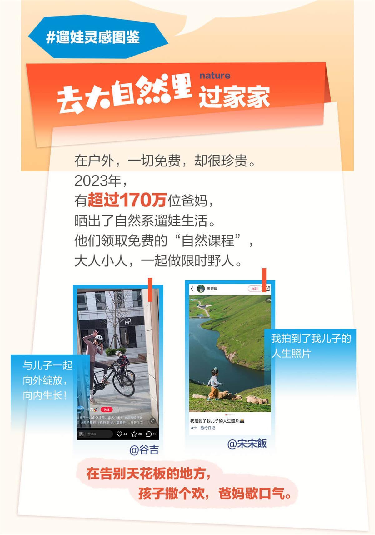 他们注重有效陪伴,崇尚“自然系遛娃”,要在没有天花板的地方,让孩子尽情撒欢。2023年,小红书上“户外遛娃”相关话题阅读量近2亿,笔记发布量超过170万。