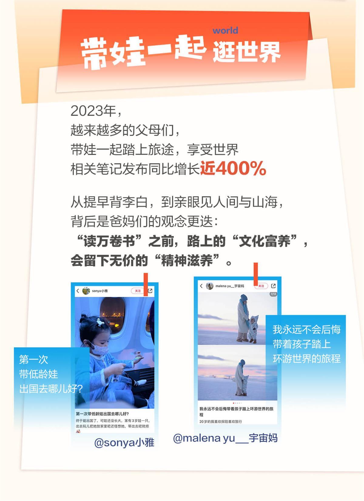 2023年,Citywalk的不止大朋友,baby们也爱上了“压马路”。在小红书上,“babywalk”相关话题阅读量近3000万。除此之外,崇尚“文化富养”的父母们还要带娃“逛世界”。2023年,越来越多的父母们,带娃一起踏上旅途,享受世界,“带娃旅行”相关话题阅读量达到了8亿,相关笔记发布增长330%。