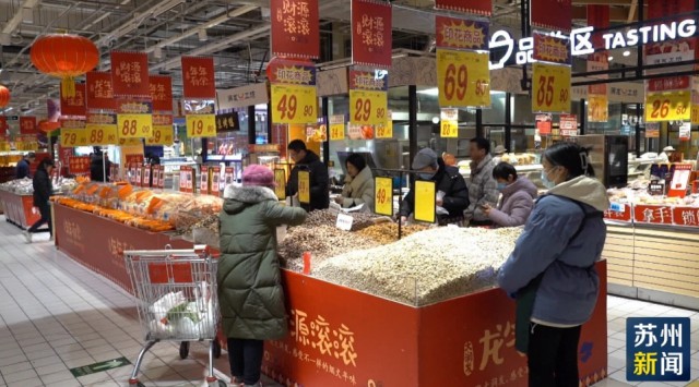 春节将至,苏州各大商超、市场都加紧备货,保证各类商品充足供应,满足市民节前消费需求。