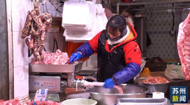 香肠、咸肉是不少苏州人春节餐桌的必备美味,这家商户晚上忙着对接猪肉批发业务,白天又早早赶来给客户灌制香肠。