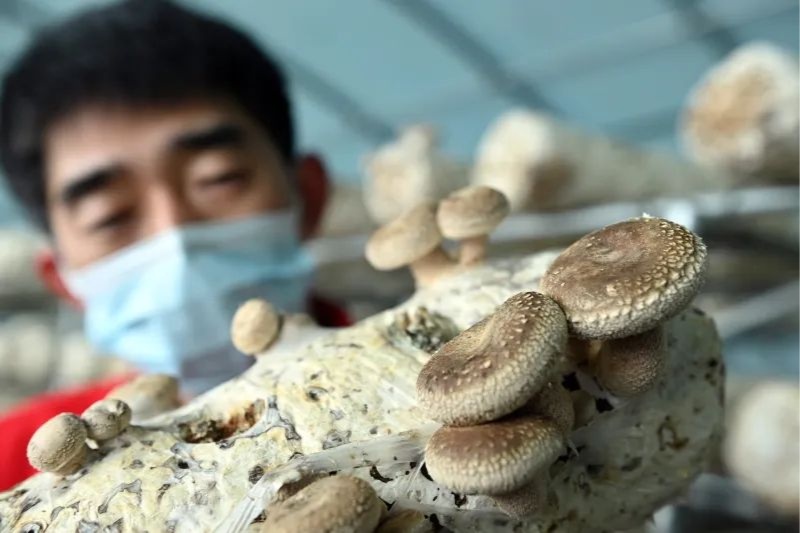 在香菇棚内,工人正在采摘香菇(薛云少摄)