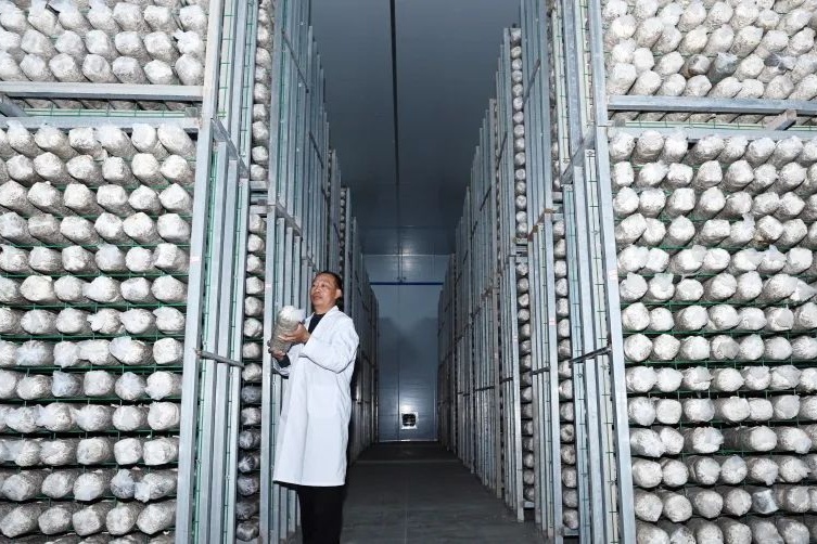 在菌菇培育室,工作人员正在查看菌棒生长情况(薛云少摄)