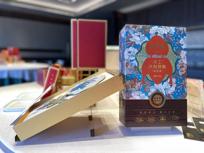 “盛世牡丹”口感再升级。今年春节前夕,全聚德集团再次推出手工片制烤鸭新品——“盛世牡丹”烤鸭伴手礼盒,让消费者在家依旧能够享受“盛世牡丹”的烤鸭香及高品位。红色礼盒配上金色花边,打开礼盒,一朵盛放的牡丹花映入眼帘。这朵牡丹花是用16片烤鸭拼摆而成。2014年,亚太经济合作组织(APEC)领导人非正式会议在中国召开,全聚德以牡丹为题,奉上一道形、意、色、香、味俱全的“盛世牡丹”烤鸭。自此“盛世牡丹”化身全聚德的文化符号,从APEC会议晚宴步入餐厅,成为食客竞相品尝的心头好。制作“盛世牡丹”烤鸭的原料选用特一级鸭坯,更大更饱满,口感再升级,几乎与堂食的“盛世牡丹”烤鸭无异,量大份足助兴团圆年。首批上市的“盛世牡丹”伴手礼盒获得高人气的市场反馈。