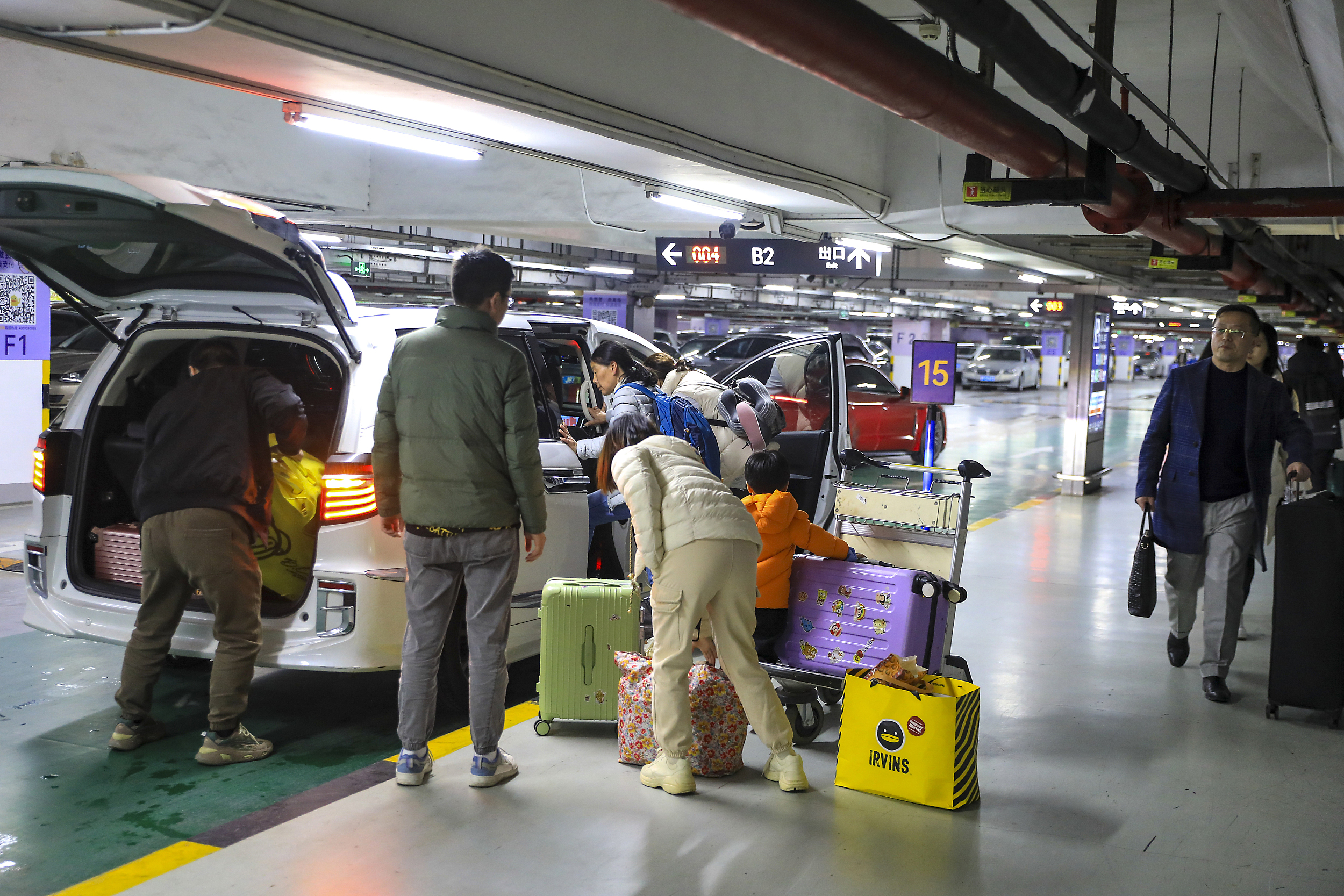 2024年2月4日,上海浦东国际机场T2航站楼,带着大批行礼的旅客在“网约车上客点”停靠区上车。