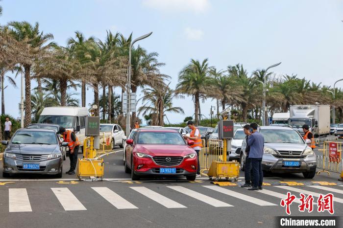 记者5日中午在海口市长乐路的小车查验点看到,双向4车道被改为东往西单向行驶,过海的小车排队经查验点时,联网的摄像头拍下车牌信息,一旁电子屏马上就显示车主所购轮渡的发船时间。若发船时间在三个小时内,车辆直行直通港口。若超过三个小时,执勤人员引导车辆驶离进港通道。