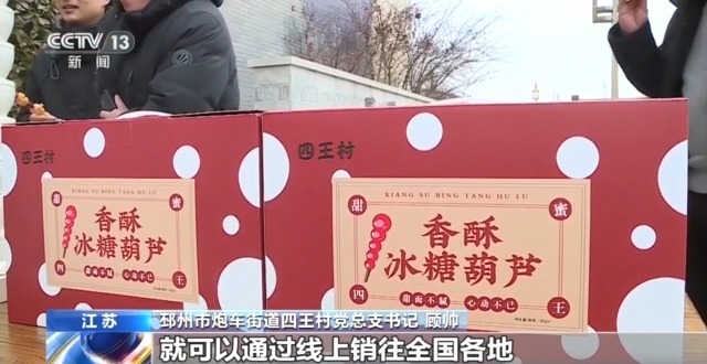 邳州市炮车街道四王村党总支书记顾帅:现在推出香酥冰糖葫芦,就可以通过线上销往全国各地,另一款新产品冷冻冰糖葫芦,通过零下18℃的低温冷链生产、储存、运输和销售。