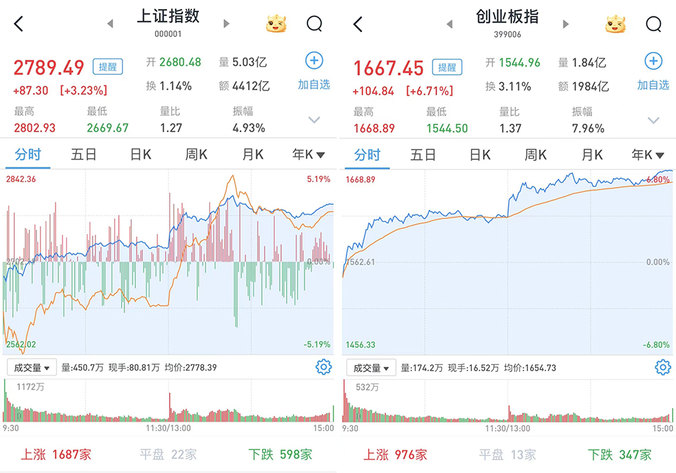 截至收盘,上证综指涨3.23%,报2789.49点;科创50指数涨6.5%,报720.8点;深证成指涨6.22%,报8460.38点;创业板指涨6.71%,报1667.45点。