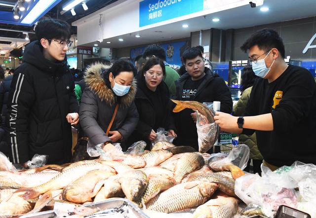 2月7日,顾客在河北石家庄新乐市一家超市选购海鲜产品。新华社发(贾敏杰 摄)
