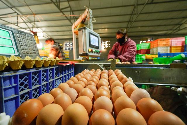 2月7日,河北省遵化市东新庄镇一家蛋鸡养殖场的工人在分拣鸡蛋准备外运。新华社发(刘满仓 摄)