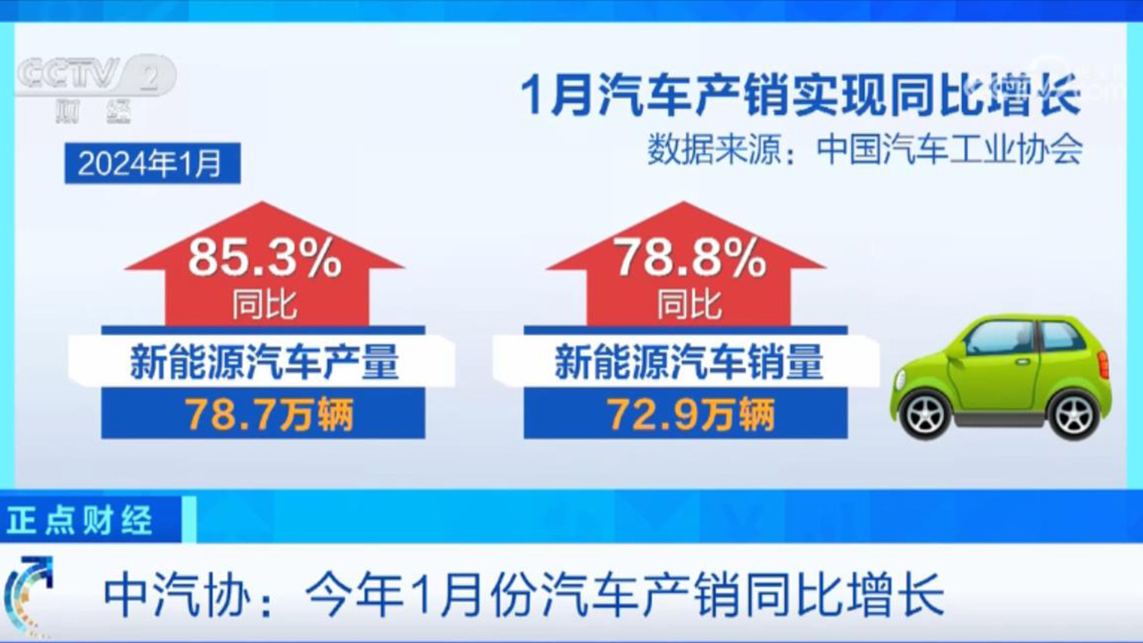 2月7日,中国汽车工业协会最新数据显示,2024年1月,我国汽车产销量分别完成241万辆和243.9万辆,同比分别增长51.2%和47.9%。新能源汽车方面,产销分别完成78.7万辆和72.9万辆,同比分别增长85.3%和78.8%。