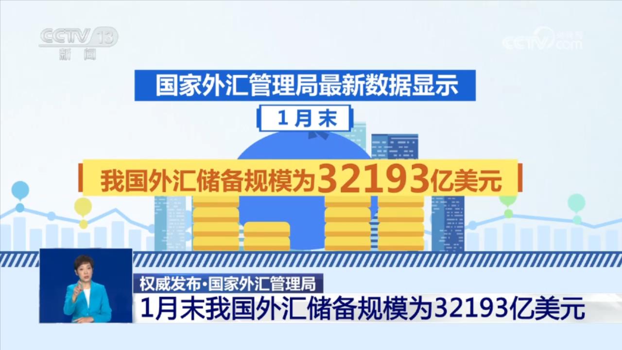 2月7日,国家外汇管理局最新数据显示,截至1月末,我国外汇储备规模为32193亿美元。