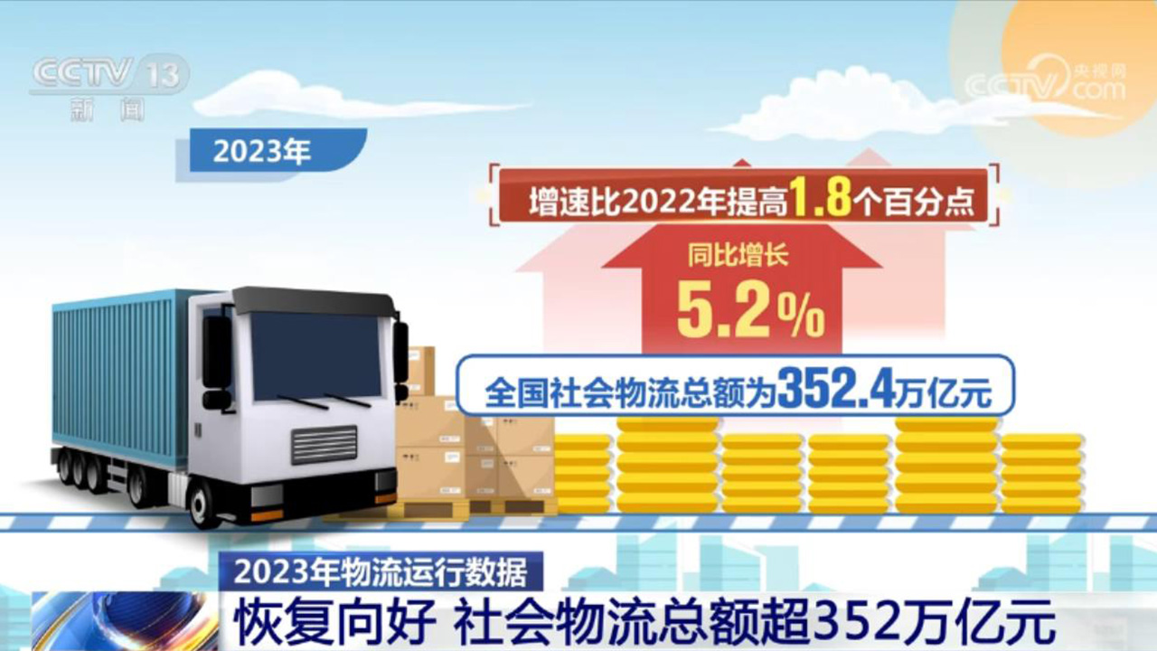2月7日,中国物流与采购联合会公布物流运行数据。2023年,全国社会物流总额为352.4万亿元,同比增长5.2%,增速比2022年提高1.8个百分点。