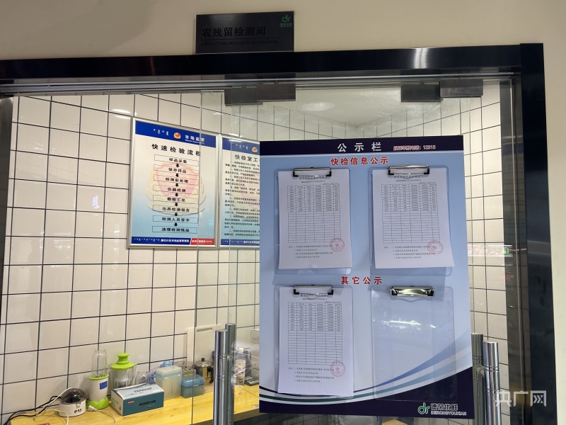 记者在超市蔬果销售区看到,食品安全快速检测室内的工作人员正在对刚刚送到的蔬果进行现场快速检测,并将测试后的结果在门口予以公示。