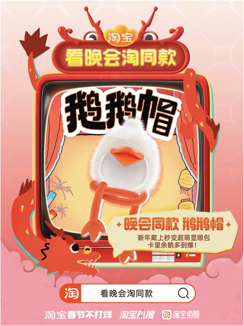 作为国民消费平台,淘宝上不仅有春晚同款,还能听主播讲解春晚妆造,买到春晚热梗PPT等虚拟商品,甚至应网友喊话发起众筹,生产上架了春晚同款鹅鹅帽。万能的淘宝成为春晚热点话题和流量转化的“终点站”。