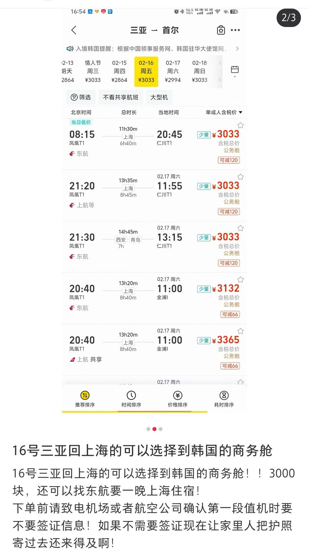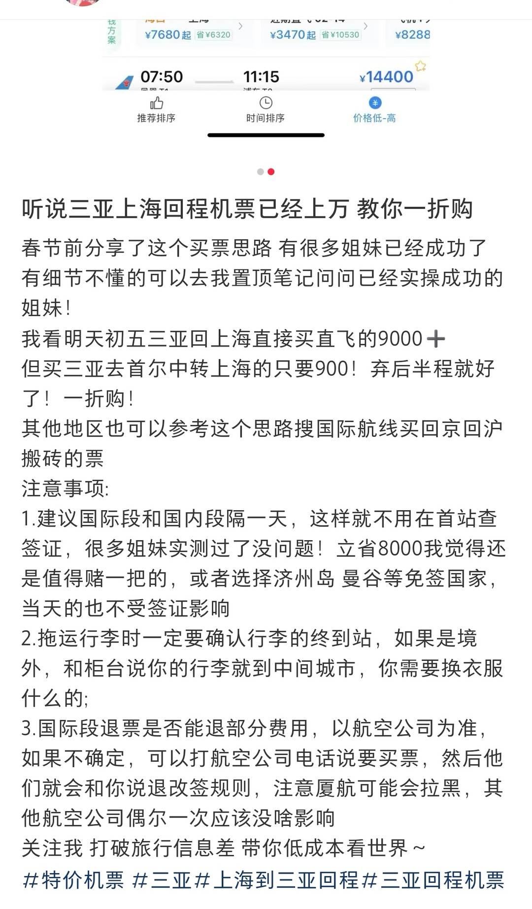 “比如16号要从三亚回上海,直飞价格肯定要过万。但如果买飞韩国的机票,在中转上海时下飞机,至少可以节约几千元。”网友“小河”分享称,她两天前查询三亚飞首尔的中转航班,全程才3000多元。到了2月14日,她再查询该航班,价格已涨到4000元-8000元。“还是比三亚直飞上海便宜!”