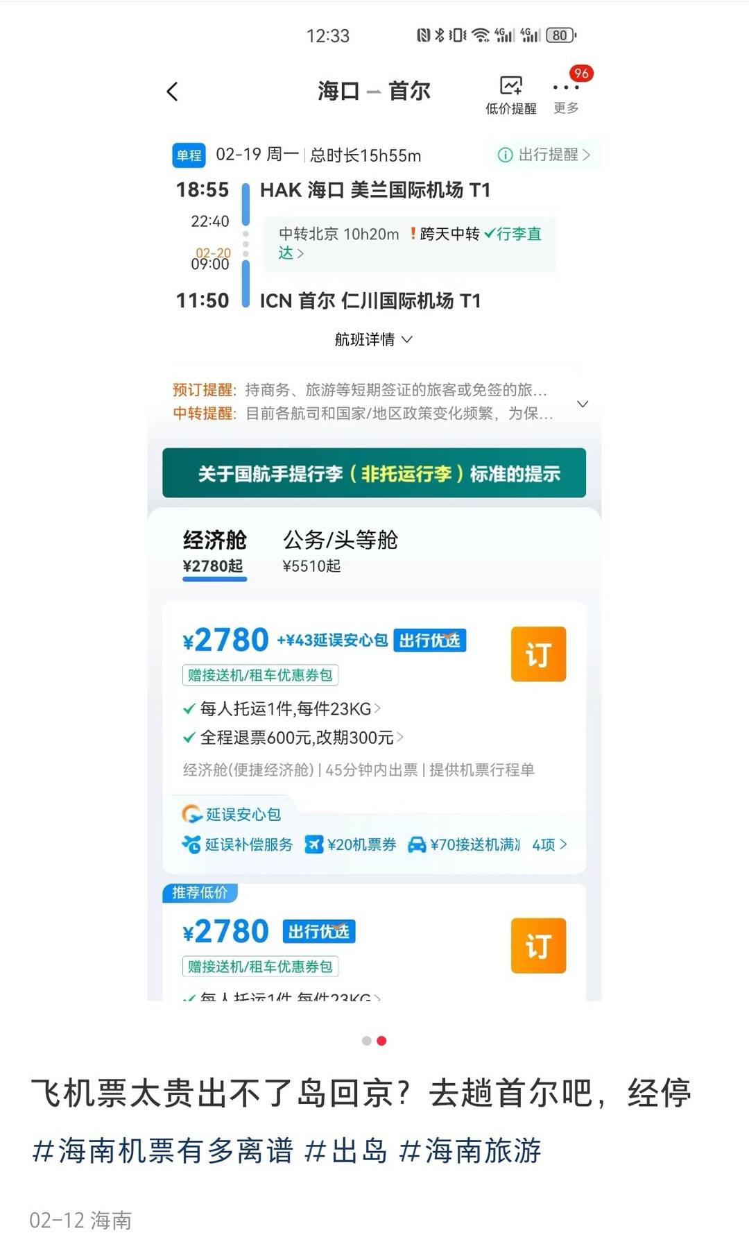 2月13日,封面新闻发布《春节三亚回程机票暴涨至万元 经济舱“一票难求”》报道后引起广泛关注。不少网友在线支招,称“可以曲线返程,买三亚飞韩国的中转航班,在国内第一段航程结束就下飞机,可以节约一大笔钱。”