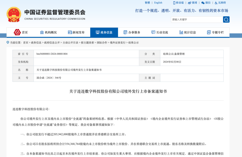 连连数字赴港IPO迎来新进展。2月18日,中国证监会国际合作部发布关于连连数字科技股份有限公司(简称“连连数字”)境外发行上市备案通知书,连连数字拟发售不超过2.06亿股境外上市普通股并在香港联合交易所上市。