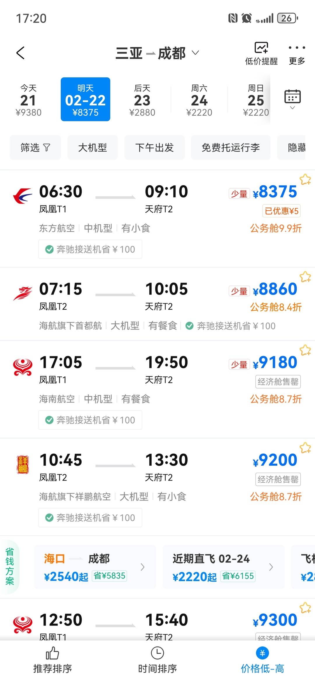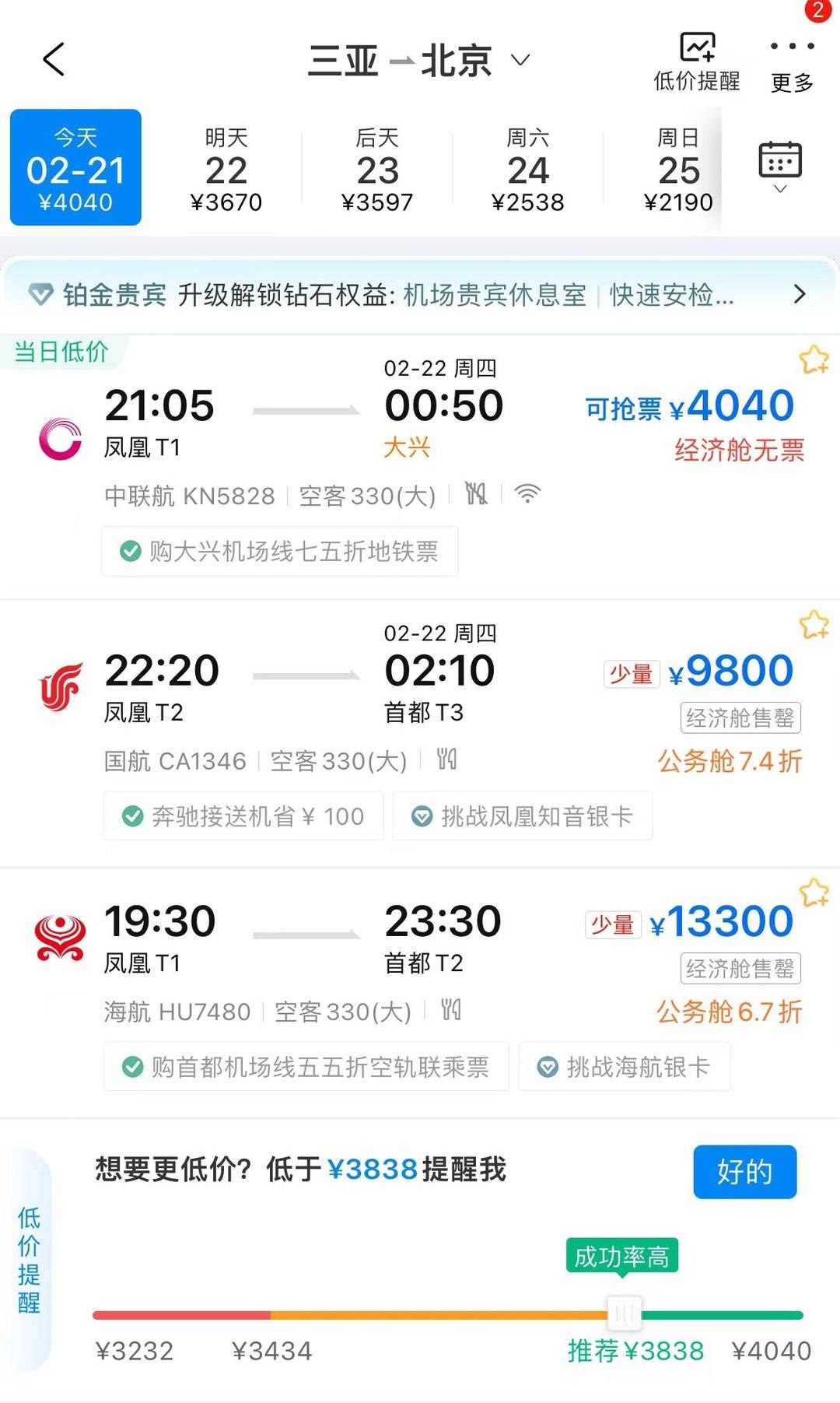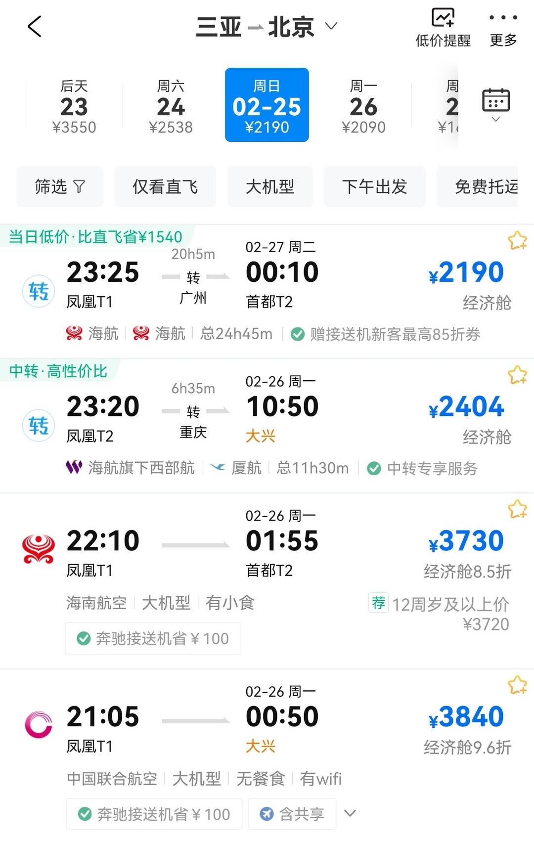 节后上班第四天,三亚回程机票怎么样了?2月21日,记者从多个OTA平台查询发现,21日-23日,三亚返程的经济舱机票均已售罄,在售的公务舱机票价格在8000元-9000元,且只剩少量余票。从元宵节(24日)起,大量的返程经济舱机票放出,价格也开始回落,集中在1000元-3000元。