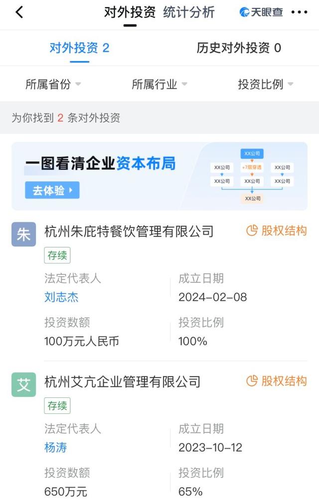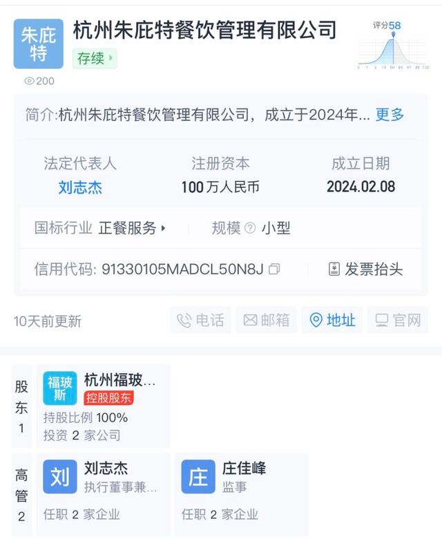 根据天眼查,这家叫朱庇特的公司成立于今年2月8日,法定代表人为刘志杰,注册资本100万人民币,经营范围为餐饮管理、外卖递送服务、互联网销售。由杭州福玻斯文化发展有限公司100%持股,杭州福玻斯的老板就是王思聪。