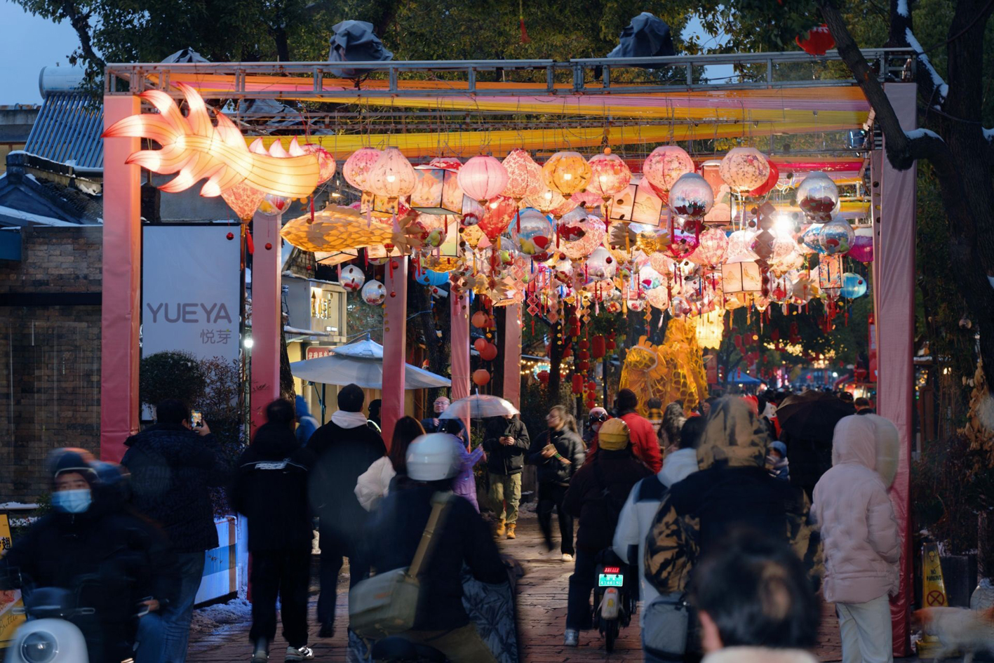 前天傍晚,扬州市皮市街银装素裹,“嗨!皮元宵”灯会正式“上灯”,雪打花灯灯愈俏,花灯映雪迎新春。伴随阵阵欢声笑语,身着冬季汉服、头戴簪花围的“小姐姐”,提花灯、执团扇,鱼贯而入,国风与古城相遇,雪色与花灯相映,演绎一场极致的中式浪漫。璀璨花灯、非遗年俗、国潮市集、特色美食,让流光溢彩的皮市街更加“上镜”,越看越“上头”。