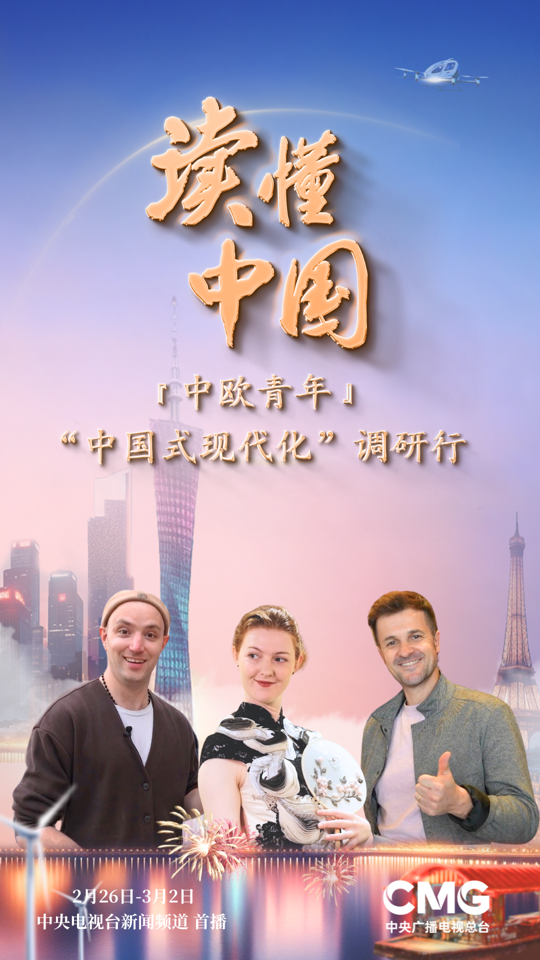 在2024年全国两会召开前夕,记录三名文化使者在广东所见所闻的6期世界看两会《读懂中国——中欧青年“中国式现代化”调研行》系列节目于2月26日起在新闻频道推出。三位欧洲青年通过实地探访和体验对话等多种方式,感受珠海北山村的变迁、广州永庆坊传统与现代的融合、空中无人飞的为大湾区低空经济赋能等,感知“中国式现代化”的深刻内涵和时代特征。