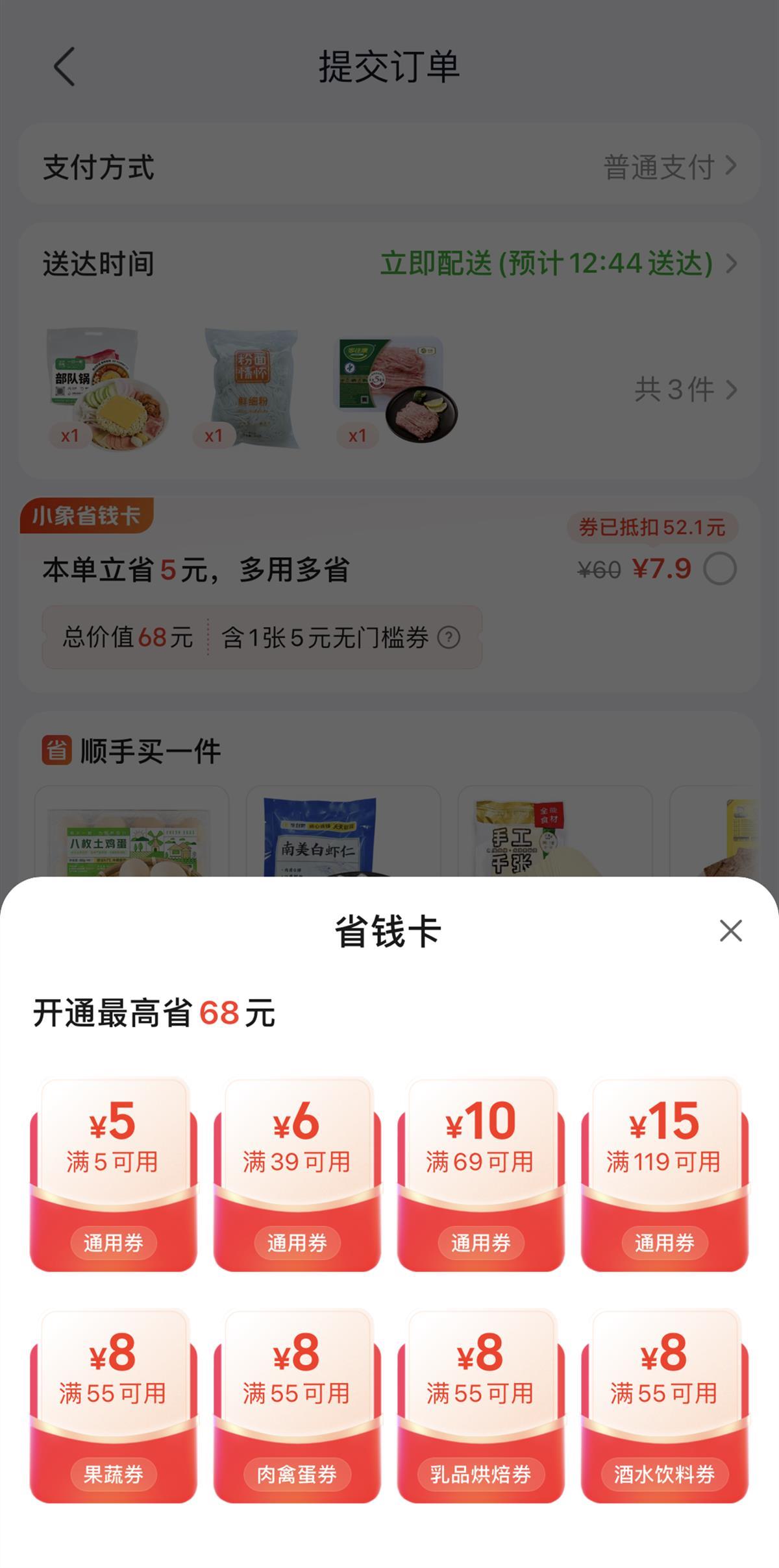 除了预订机票,不少电商平台和线上超市早已是“省钱卡”的老玩家了。在某一线上超市上,市民林女士下单水果、蔬菜、猪肉等商品后,结算页面提醒可以花7.9元购买省钱卡。省钱卡总价值68元,包含一张5元无门槛券,满39元可减6元、满69元可减10元、满119元可减15元的优惠券,及一些乳品烘焙、酒水饮料等特定品类券。