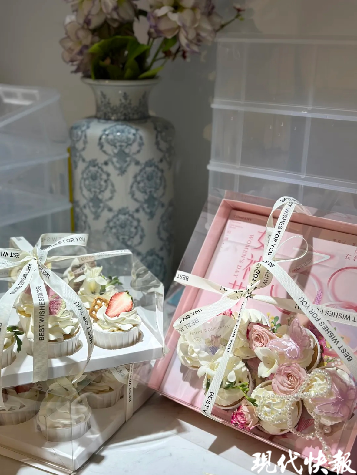 除了鲜花,女生钟爱的还有各种甜食。近期,大大小小的蛋糕店也迎来销售小高峰。一家位于南京江宁区的手工甜品店推出了限定包装纸杯蛋糕。这种纸杯蛋糕6个一组,售价为60元。蛋糕搭配上鲜花、珍珠、彩带等配饰,一眼看上去少女心爆棚,让人爱不释手。
