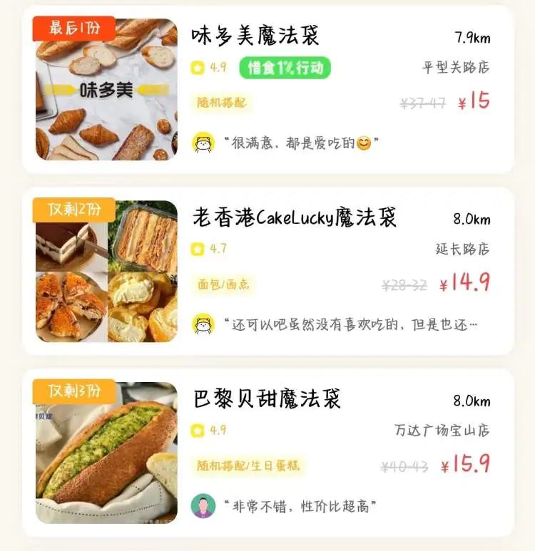 为什么会如此?这或许与这种剩菜盲盒的销售方式有关:线上预订,线下领取。页面会显示商家距离顾客的距离,也就是说,如果网上下了单,无法在家中等送货上门,除非再斥资请个跑腿,但这样做价格优势将荡然无存。而亲自上门取货,受季节、天气、距离等因素的影响很大。