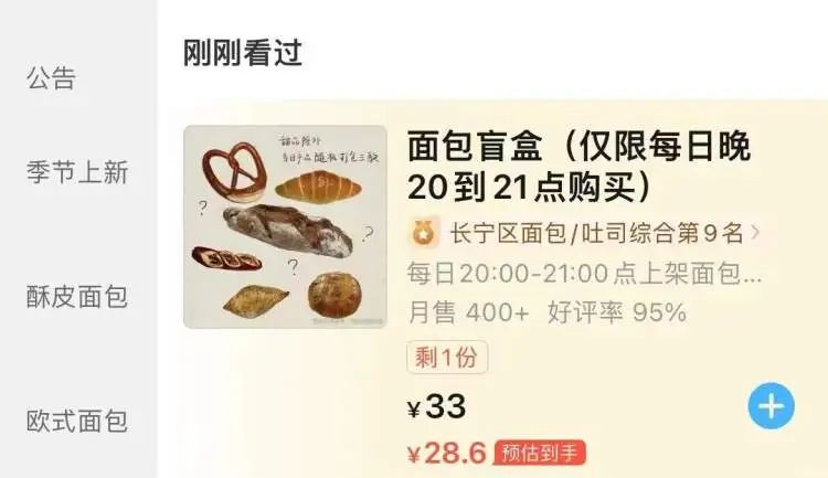 还有少数商家会在晚上限定时段推出当天的“面包盲盒”。比如,愚园路一家面包店每天晚20:00-21:00的一个小时会推出限时面包盲盒,月销量在400份以上,可谓十分畅销。而其他时段,则没有出现这一选项。
