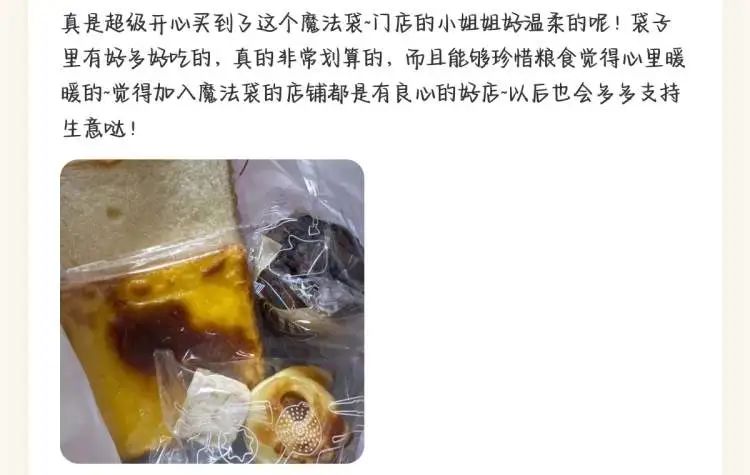 每天晚上,这家小店都会将剩下的面包,每3-4个品种打包成一份盲盒,上架该小程序,接受网上预订。顾客在网上下了订单付费后,按照约定的时间来线下店铺取面包。一些买家回家后会将获得的面包拍照,在商家页面晒单,评价合算与否、会不会回购,给后来者参考。
