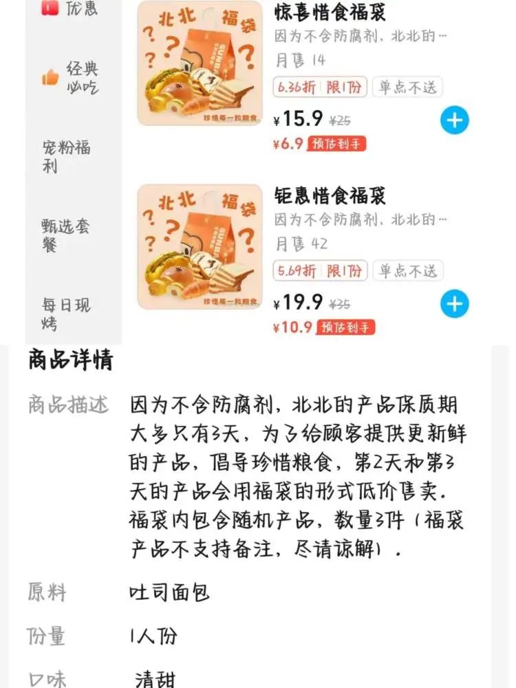 在商品描述中,商家写到“本店面包的保质期大多只有三天,为了给顾客提供更新鲜的产品,倡导珍惜粮食,第2天和第3天的产品会有福袋的形式低价售卖。福袋内包含随机产品,数量三件,不支持备注,敬请谅解”。