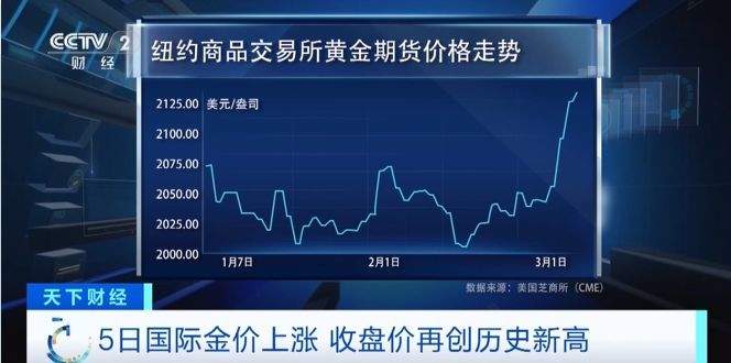 期货价格也呈现类似走势。当地时间周一,COMEX4月交割的黄金期货价格上涨1.46%,报收每盎司2126.3美元,刷新了该合约自1974年创立以来的最高纪录,周二,涨势也继续延续。华尔街分析人士称,金价还有上涨的空间,而这种涨势可能会持续到今年下半年。
