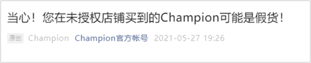 2021年5月,Champion在官方微信公众号上发表声明称,很多Champion专卖店进驻中国各大卖场,但其中不少并未取得在中国开设专卖店的品牌授权。