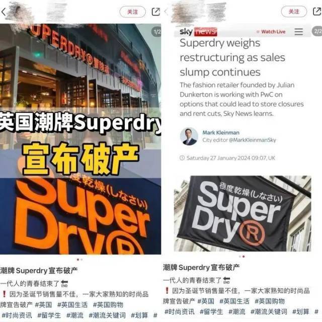 英国本土潮牌Superdry也于今年1月也宣告破产,又是一代人的青春“结束”。很多人在听到Superdry时可能不大熟悉,但是该品牌曾在中国开过分店,和大多数外资品牌的命运差不多,可能因为“水土不服”退出中国市场,最终以破产告终。