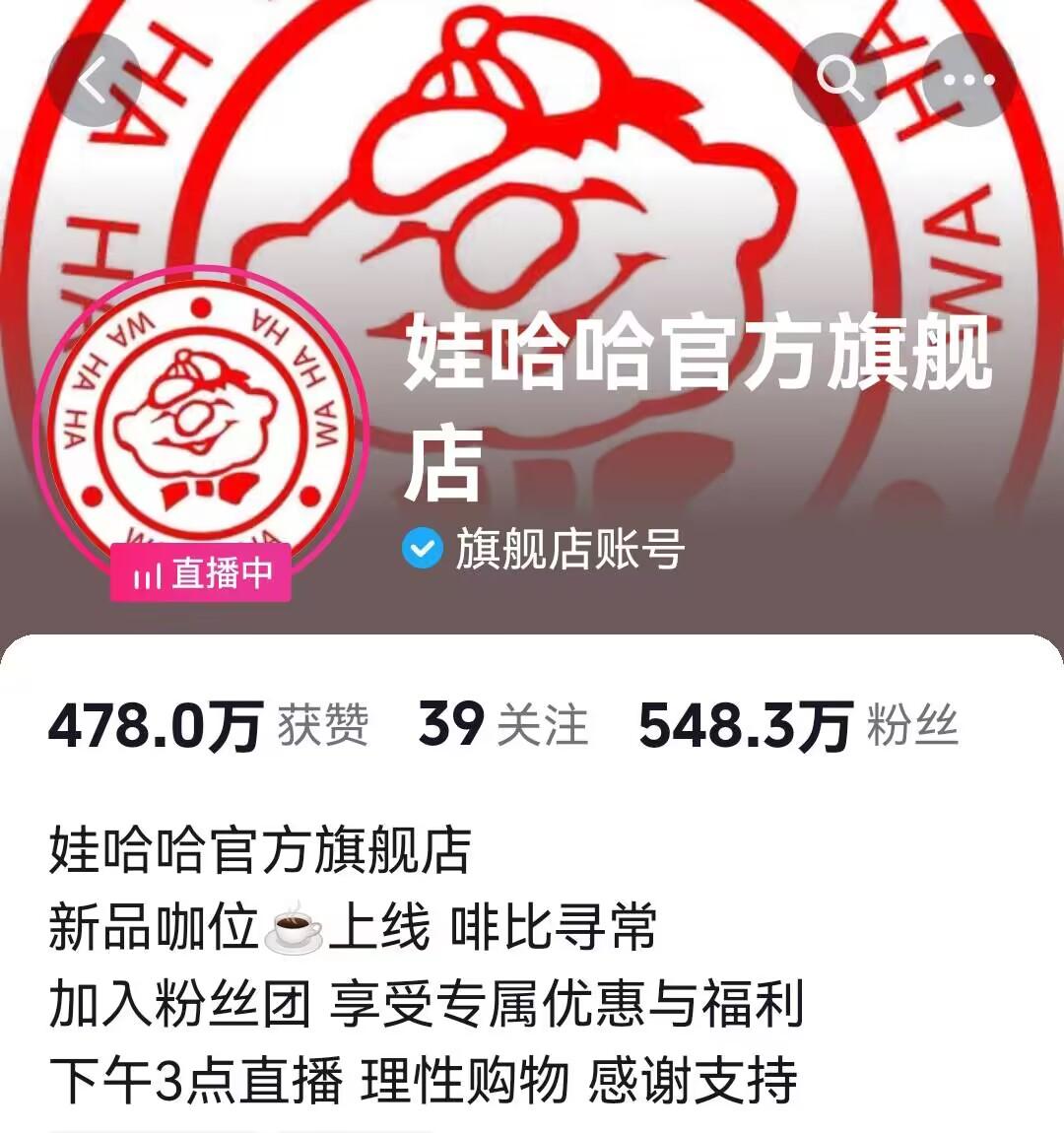 △娃哈哈官方旗舰店抖音账号粉丝已有近550万