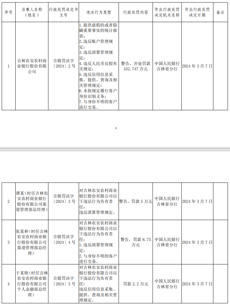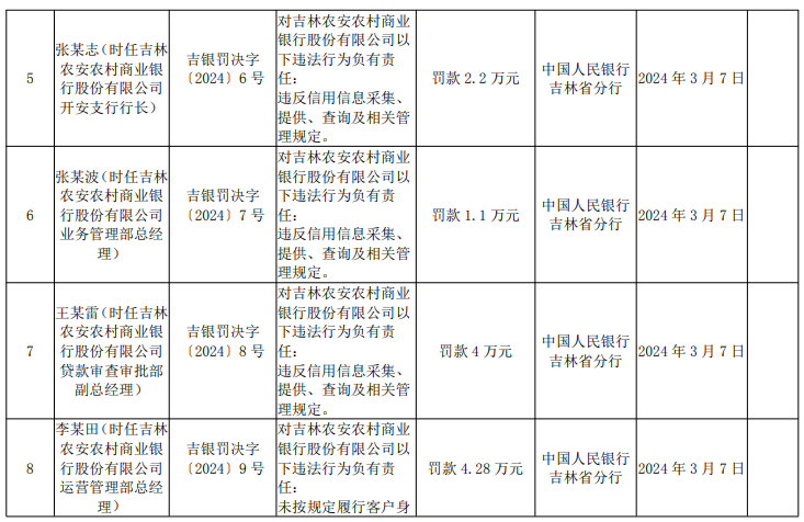 因对以上违法行为负有责任,时任吉林农安农商银行渠道管理部总经理谭某被警告并罚款5万元;时任吉林农安农商银行渠道管理部总经理张某和被警告并罚款6.75万元;时任吉林农安农商银行个人金融部总经理于某艳被罚款2.2万元;时任吉林农安农商银行开安支行行长张某志被罚款2.2万元;时任吉林农安农商银行业务管理部总经理张某波被罚款1.1万元;时任吉林农安农商银行贷款审查审批部副总经理王某雷被罚款4万元;时任吉林农安农商银行运营管理部总经理李某田被罚款4.28万元。