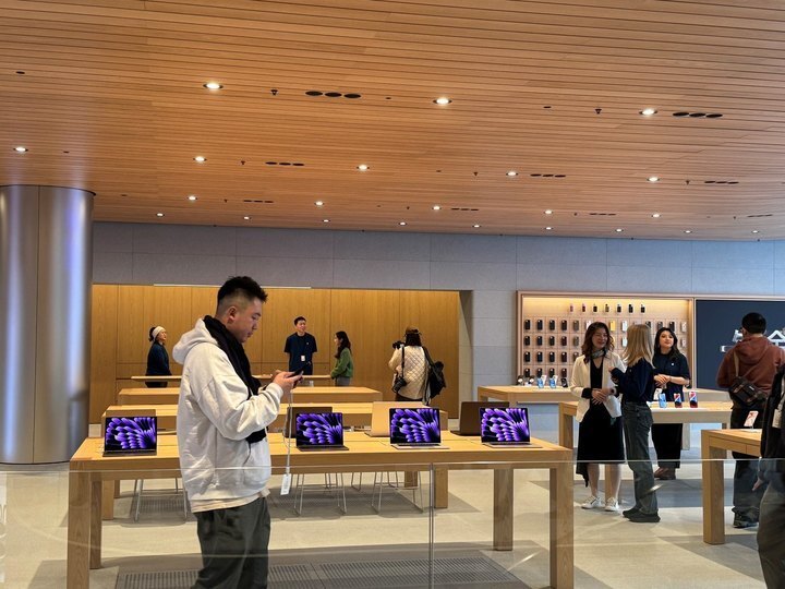 跟其他的苹果零售店一样,一楼和负一楼两层店面摆满了苹果各类产品。顾客可以探索周围的产品展示桌与avenue长廊,了解最新的iPhone15系列机型、搭载强大M3芯片的全新13英寸和15英寸MacBook Air,以及率先实现碳中和的Apple Watch Series 9系列产品。我们欢迎寻求服务和支持的顾客预约Genius Bar天才吧服务。