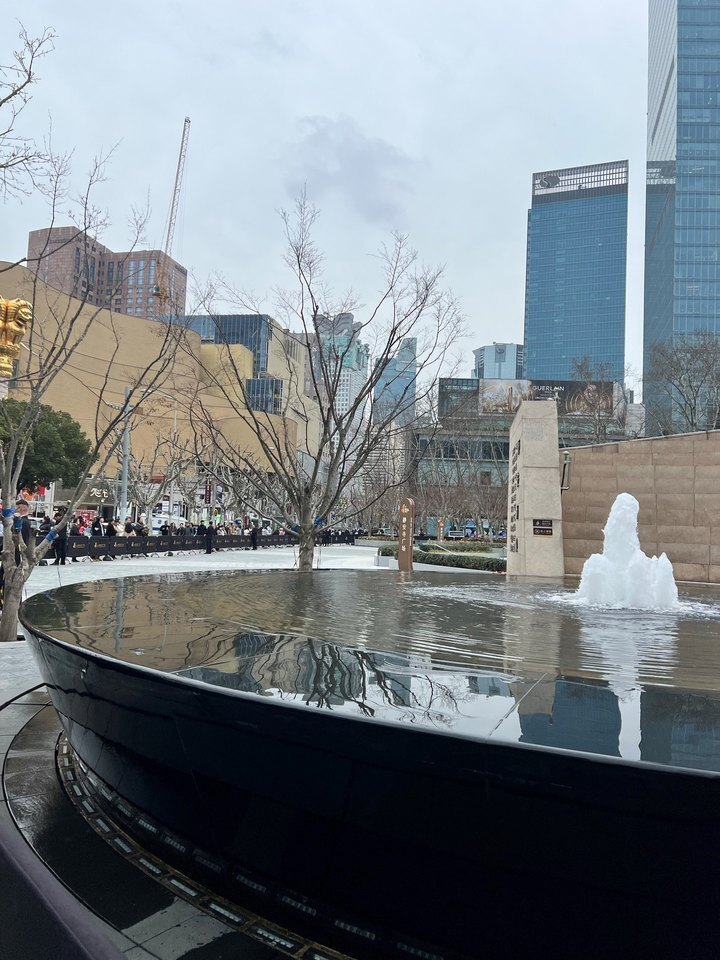 穿过广场上方的一片枫树林,静安寺的迷人景致便映入眼帘。沿着巴东芝麻白花岗岩铺设的台阶拾级而下,便会看到阶梯状的双曲面墙体向前延伸,围拢成一个圆形的剧场,来到Apple静安零售店正门口的弧形玻璃幕墙。