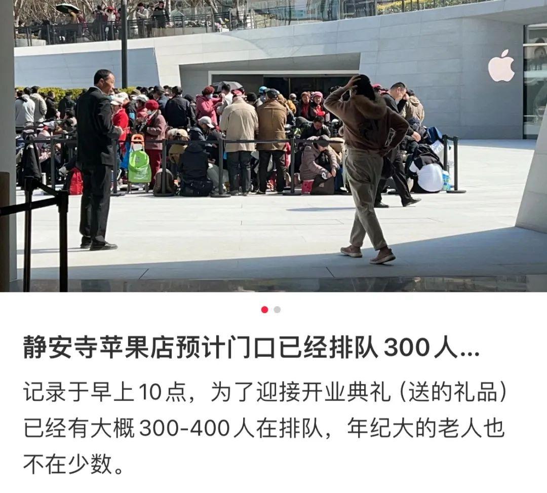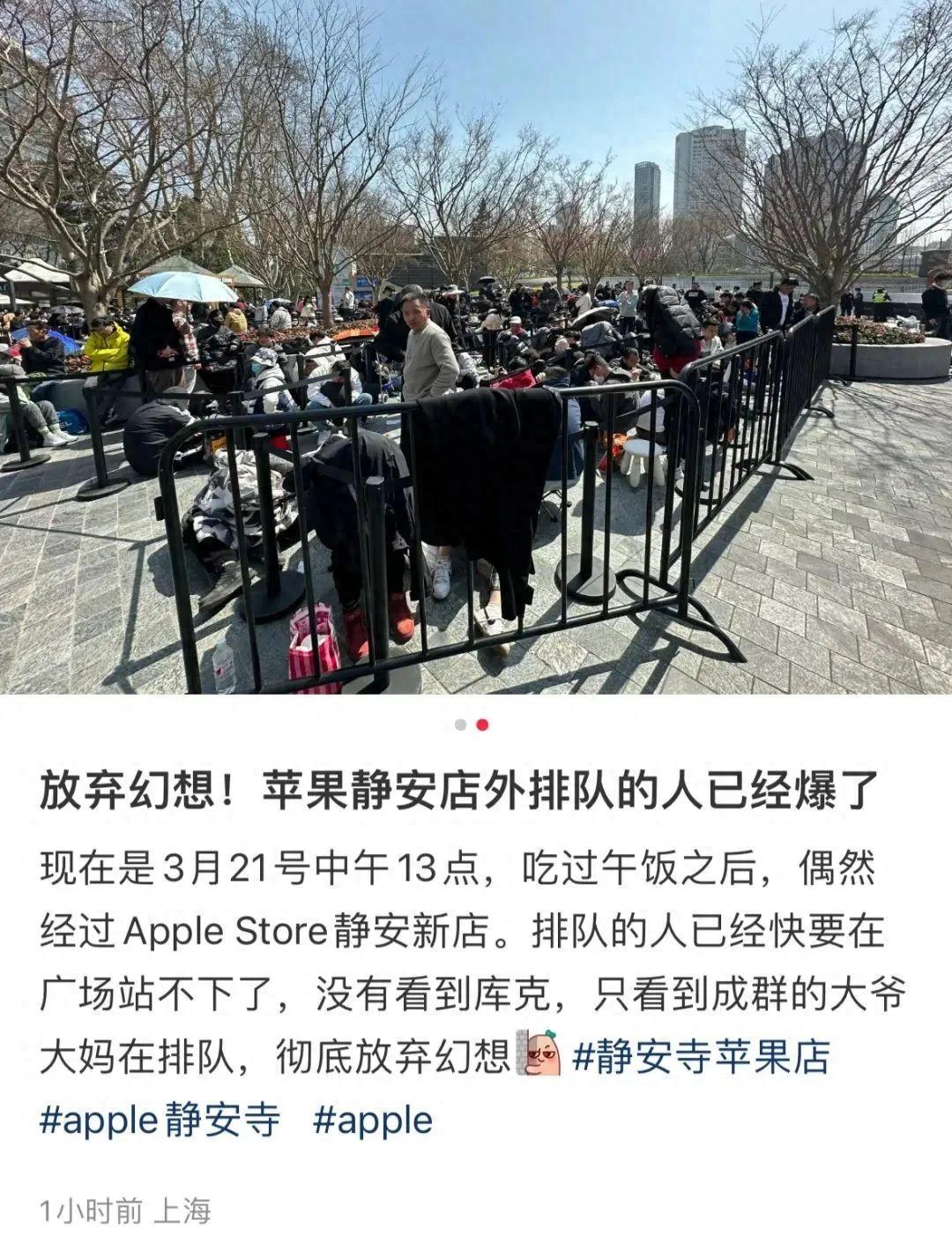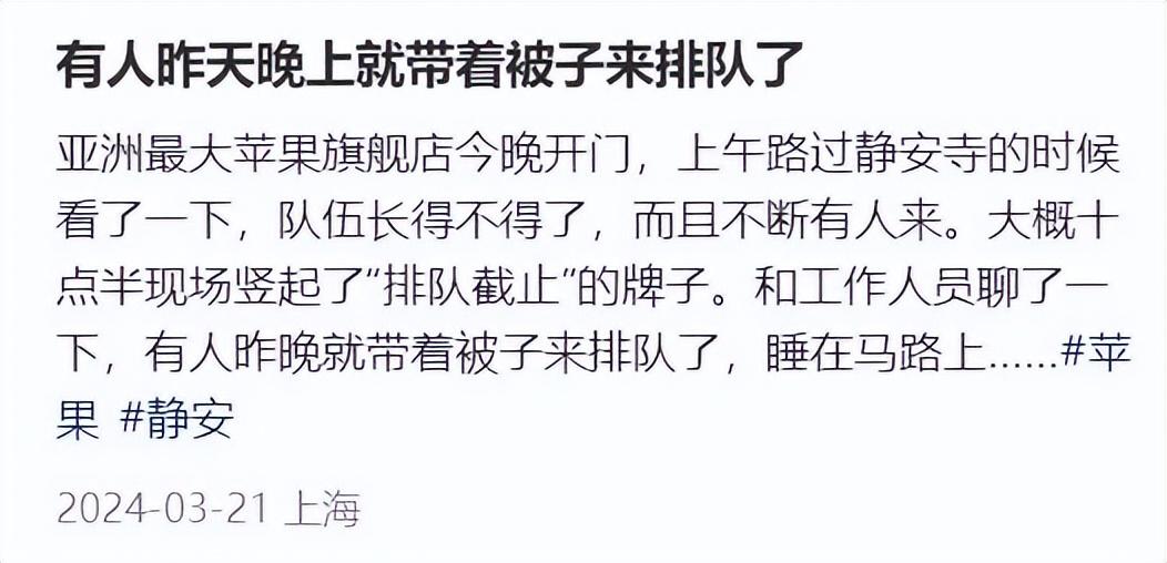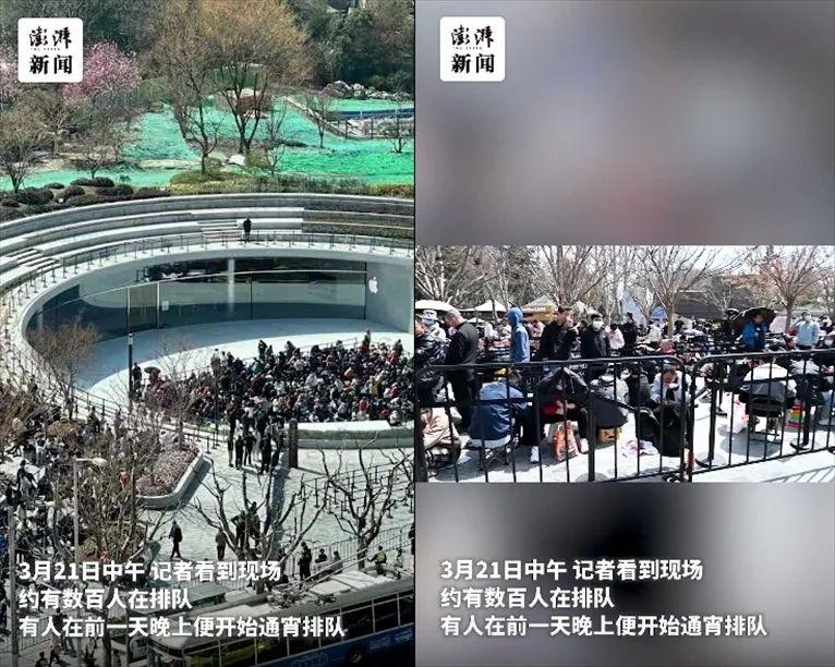 据看看新闻报道,21日凌晨,记者来到尚未开业的静安店门口时发现,尽管距开业还有近20小时,已有数十位来自全国各地的“果粉”在现场等候。据现场群众介绍,进入后半夜后,现场出现了黄牛“代排队”的现象。不过,也有群众主动帮助维护现场秩序。至清晨6时后,开始有工作人员组织排队,并开始为正在等候的100余人发放手牌,总体秩序稳定。