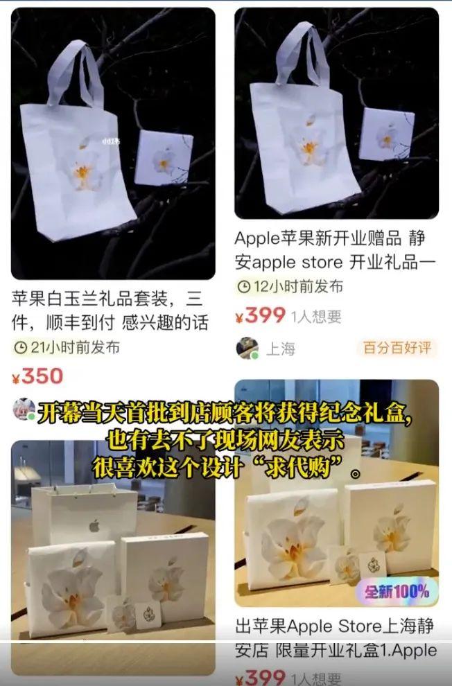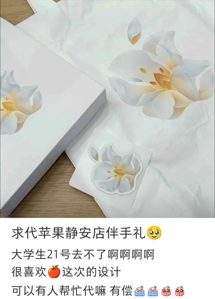 苹果为此次静安店的开幕准备了特别的礼品,其巧妙地融入了上海的市花白玉兰,受到了不少“果粉”的追捧。不过,这次漂亮的礼品设计不仅吸引来了“果粉”,还吸引来了黄牛。