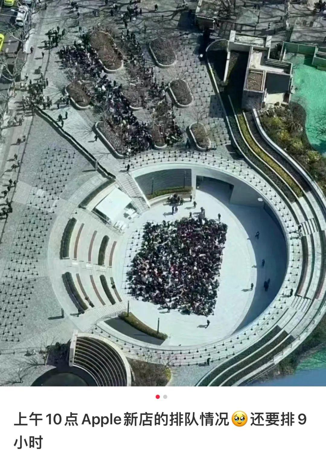 苹果店还为排队的人群发放饮用水,网友调侃等下这水也会上二手平台上卖了。