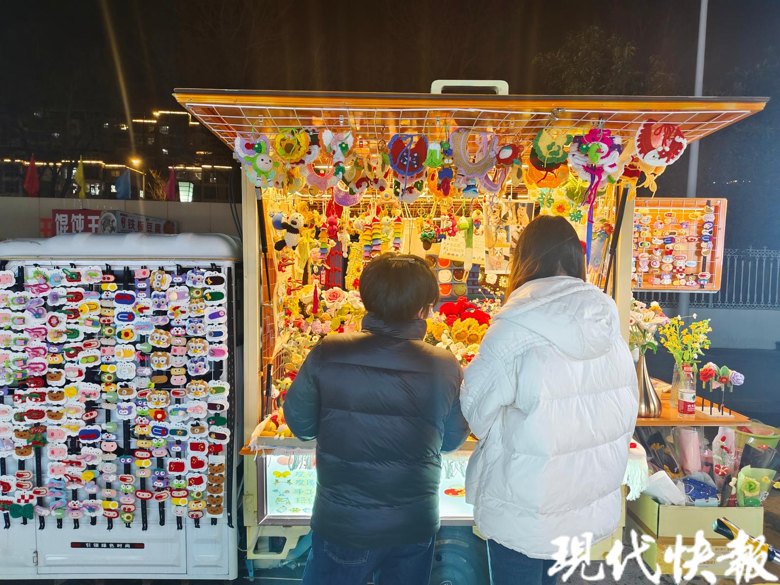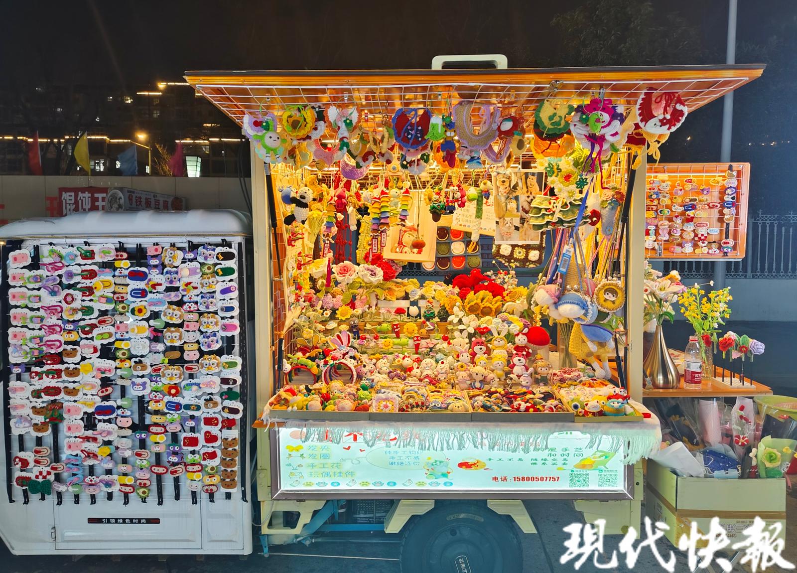 夜幕降临,盐城市盐都区的神州路网红夜市,热气腾腾、香飘万里。在烟火气十足的夜市里,夹杂着一家卖手工针织品的小摊,放着琳琅满目的发夹、发圈、手工花、玩偶挂件等,做工精致,颜色清新。